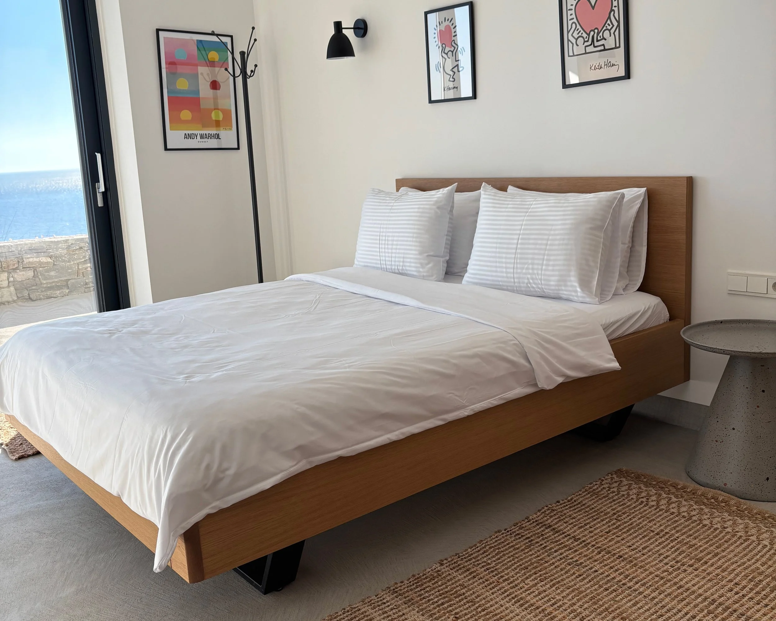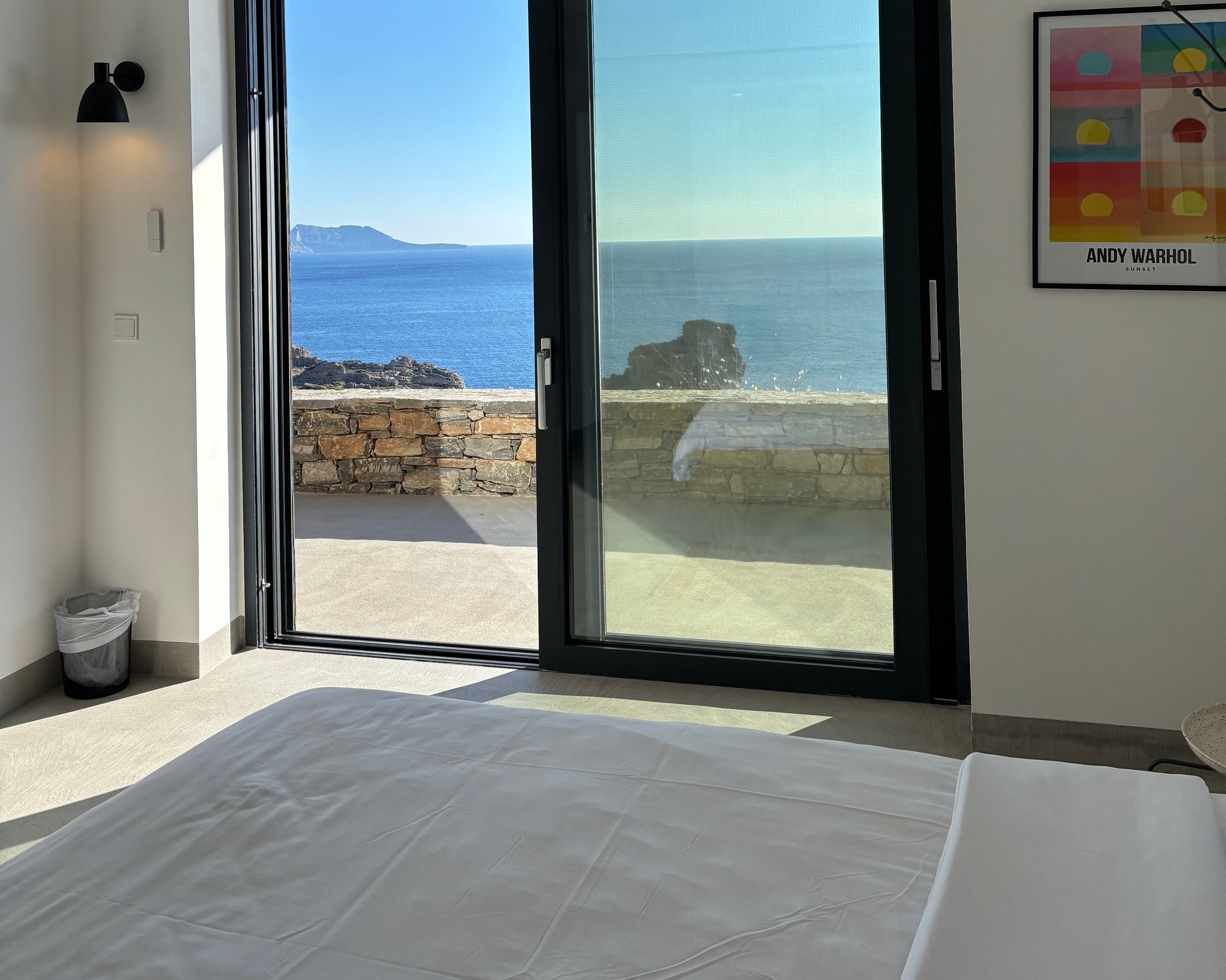 Designed in minimalist, modern style using local materials which merge with the natural surroundings, Eulimene spans two fully air - conditioned floors. Decorated in cool shades of blue and grey, the interiors are light and breezy as the sea, sun and sky pour in through the large windows. Each floor opens onto a broad sweeping terrace that wraps around the house offering expansive sea vistas from every room. The area around the house has been planted with olive trees and Mediterranean plants and herbs that deeply connect with the surroundings. On the upper floor at entry level, you’ll find a spacious open-plan living room featuring an oversize, plush sofa perfect for curling up with a book or just gazing out at the view and watching the light change.